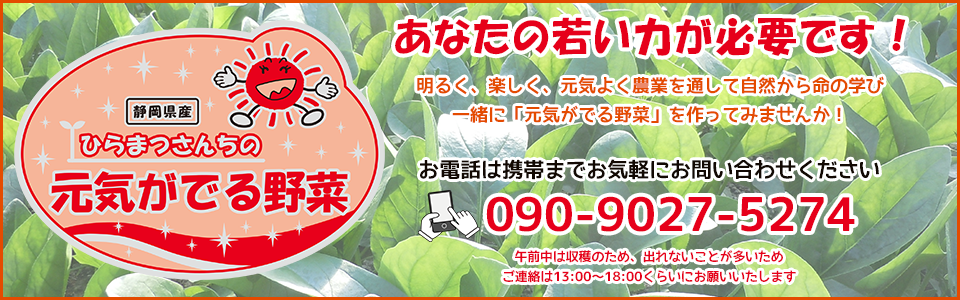 | 募集内容 | 1.パートタイマー (午前中のみ) ・収穫・出荷作業を、お手伝いいただける方。 *30代~50代の主婦の方々が、活躍中です。 2.フルタイムパート (午前・午後) ・勤務形態が、正社員では難しい方。 ・正社員になる前に、先ずは「農業を体験」して自信を深めたい方。 |
